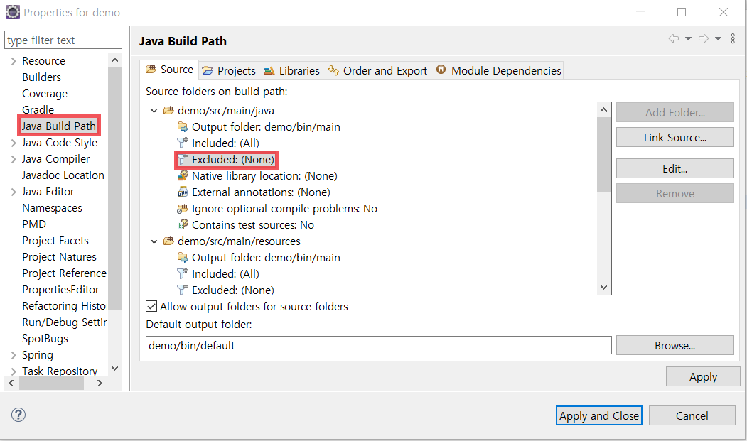 왼쪽에 Java Build Path 선택 후, Source탭을 클릭하시면 아래와 같이 Excluded: (None)이라고 표기되어 있는 부분이 보이실 겁니다.